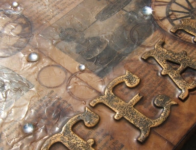 The head was created with black Apoxie Sculpt and I purposely kept the facial features to a minimum because I didn't want it to look too human. The goggles were handmade using snaps and small rings which was fitted with copper/green iridescent film and filled with resin.